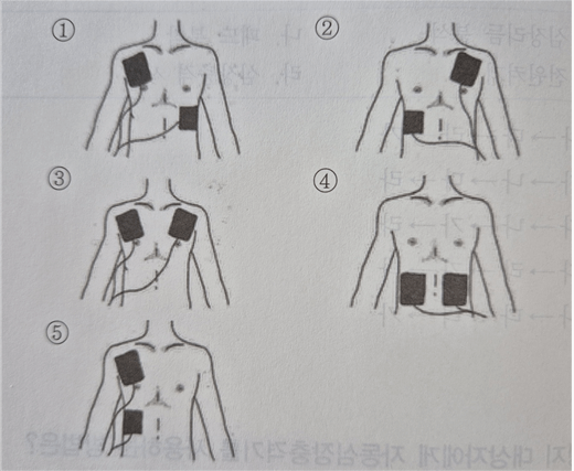 3. 자동심장충격기의 패드 부착 위치로 옳은 것은?